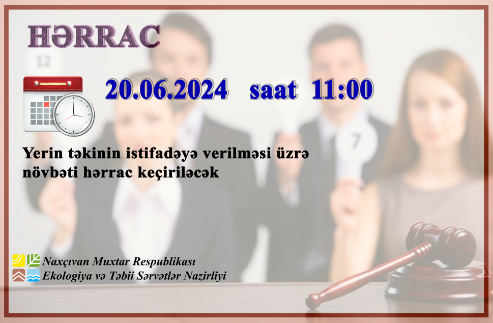 Yer təkindən istifadə ilə bağlı 20 iyun 2024-cü il tarixində saat 11:00-da keçiriləcək hərracın elanı Hərrac auksion formasında keçiriləcəkdir. Babək rayonu “Naxçıvançay I” qum-çınqıl yatağı № ...